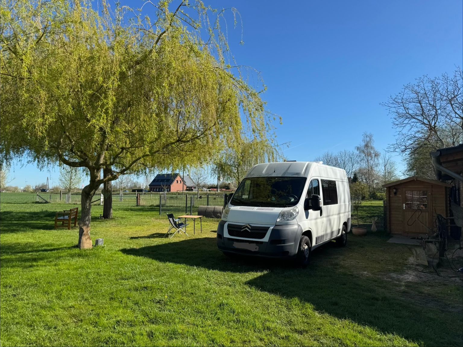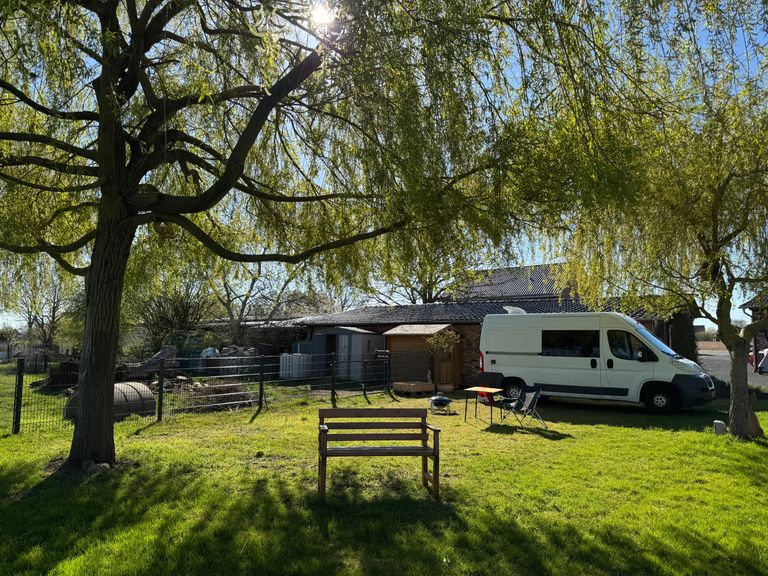 Location & Ambience 🌳🔥: Your campsite is located on the east side of our farm on a large meadow. You’ll be camping between two willow trees with a view of our mill tower and the farmhouse. Right nearby are our barrel sauna and the rain shower under the linden tree. You’re also welcome to borrow our fire pit. At the edge of the meadow stand young fruit trees of old varieties from a NABU orchard project—feel free to help yourselves to the fruit. You’ll have a view of our farm—every now and then we’ll dart across the scene, and occasionally a piece of farm equipment will be in use.