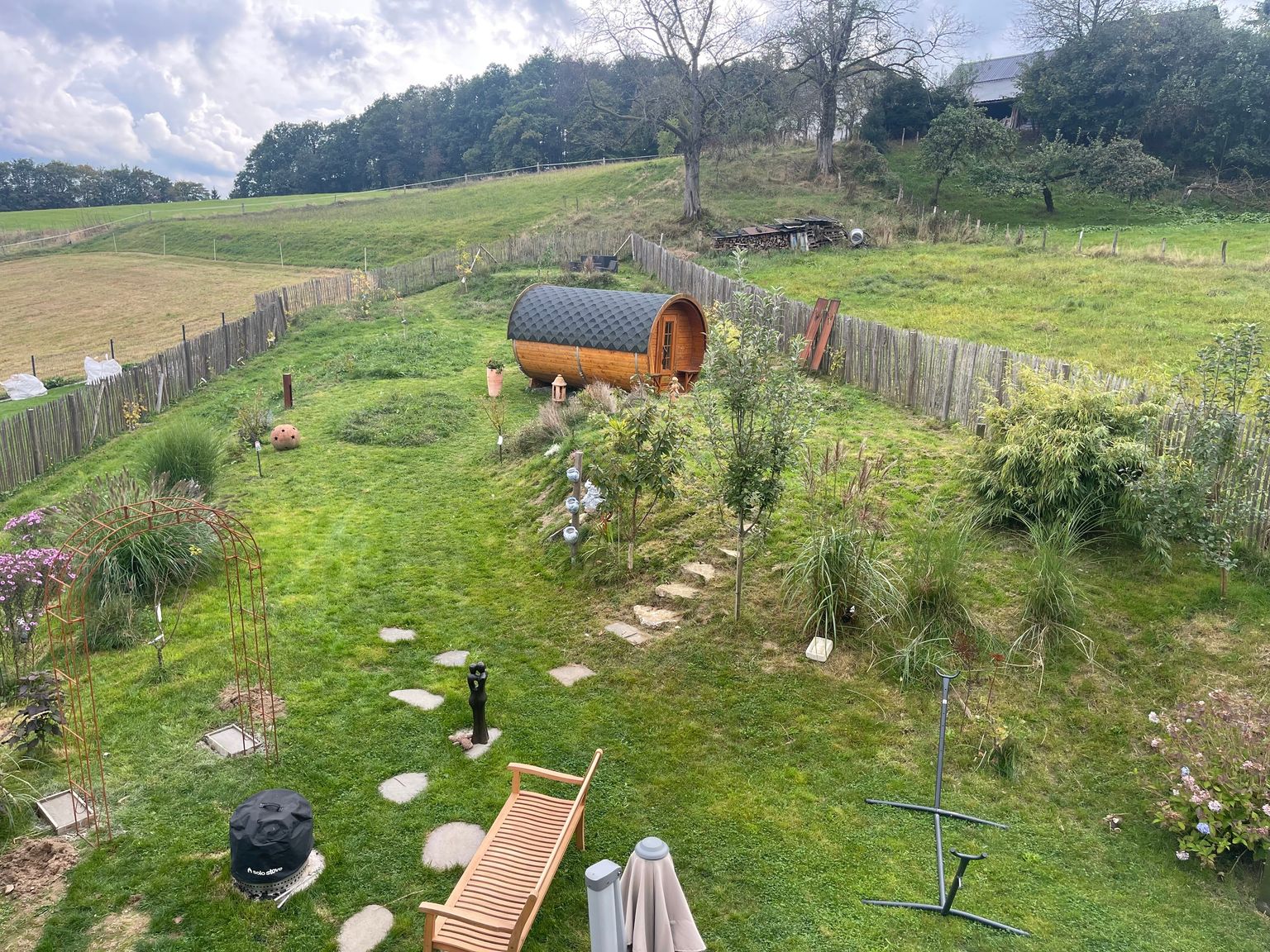 Welcome to Villa Kunterbunt. We offer our “Biggesee” sleeping barrel with a panoramic window in our beautiful garden, plus an additional tent for children and