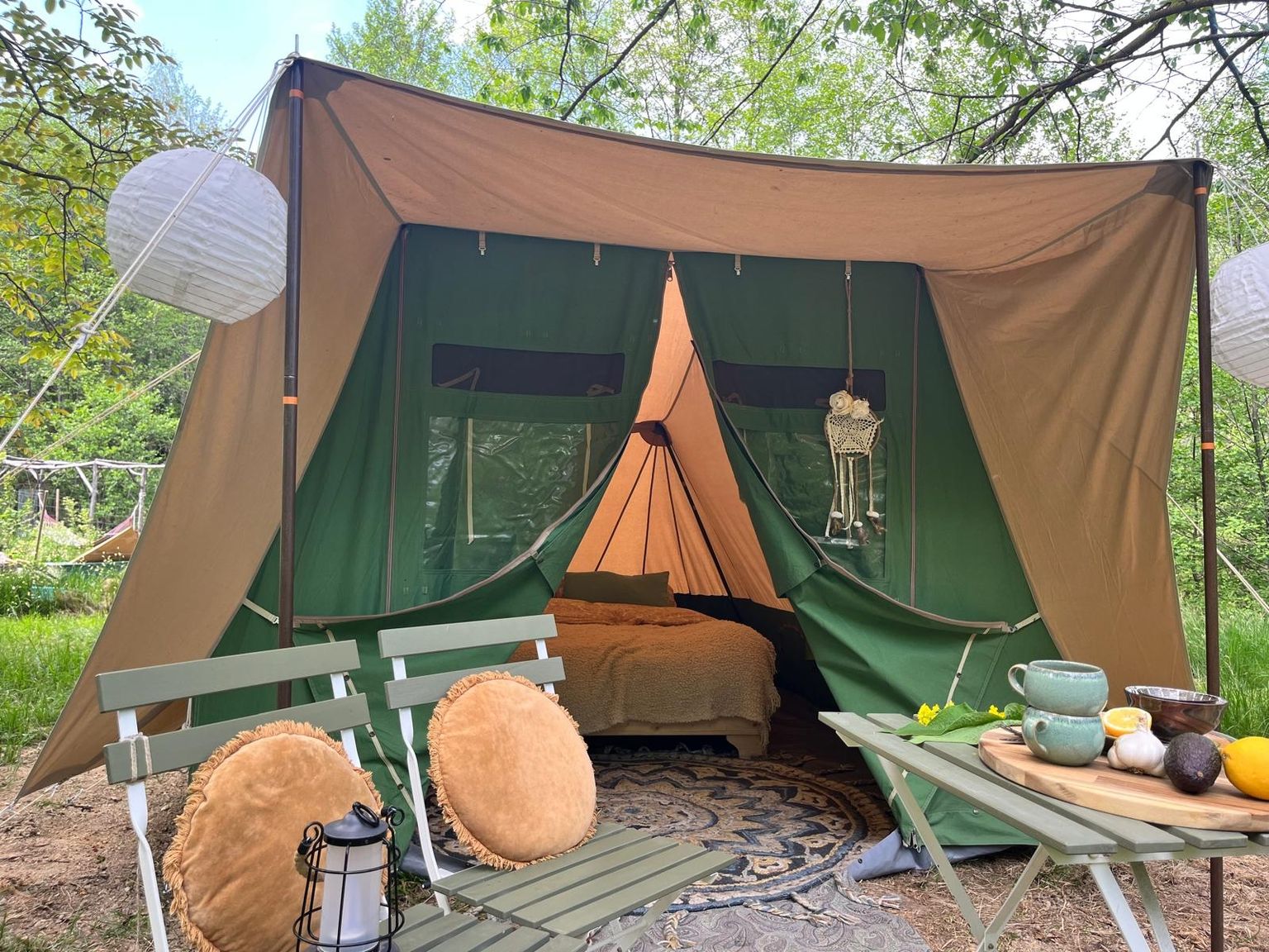 Un bonito espacio llano en la ladera de nuestra montaña, enclavado entre dos grandes árboles: un nogal y un majestuoso cerezo. Aquí encontrarás una tienda de lona clásica de la reconocida marca holandesa De Waard, famosa por su calidad y comodidad.