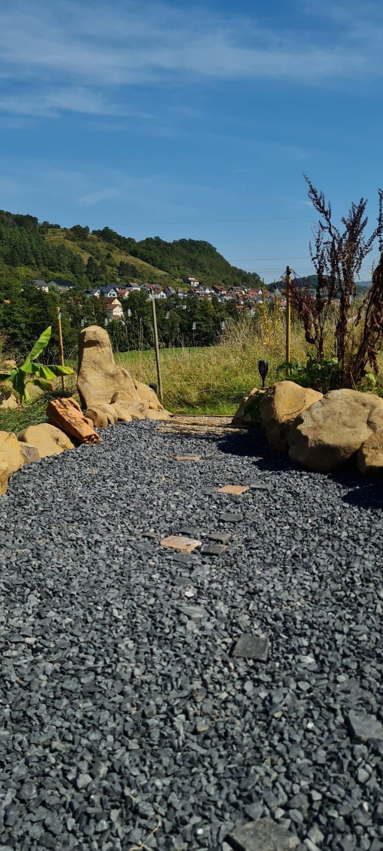 Mais avant et après vous être blottis, profitez de l'une des nombreuses places assises dans notre jardin de 2 000 m² pour admirer la vue panoramique sur la vallée de la rivière et le petit village d'Herolz.