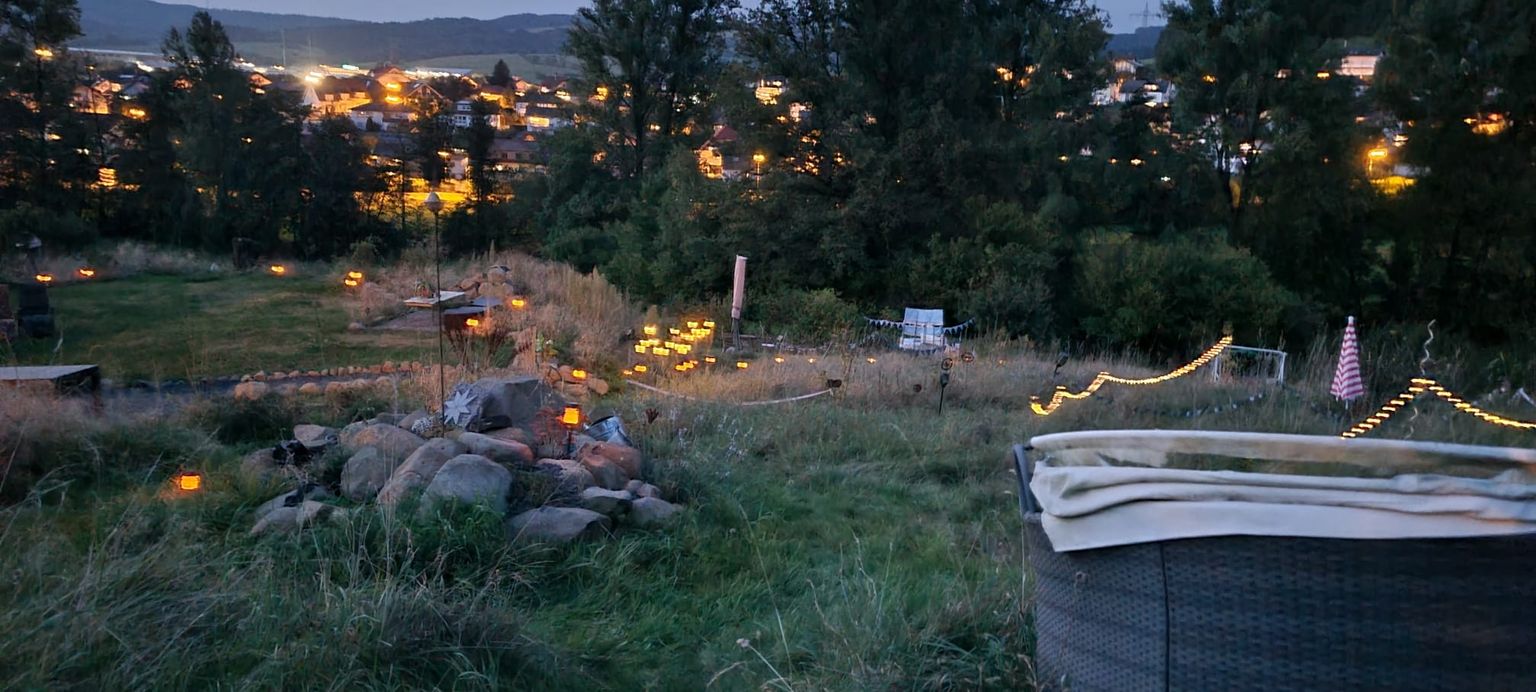 Mais avant et après vous être blottis, profitez de l’une des nombreuses places assises dans notre jardin de 2 000 m² pour admirer la vue panoramique sur la vallée de la rivière et le petit village d’Herolz.