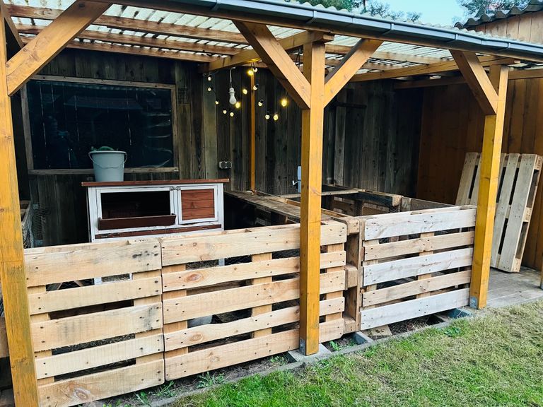 Nous avons trois lapins, une tortue et une chienne. Des poules apprivoisées vivent sur le terrain et pondent de délicieux œufs.
