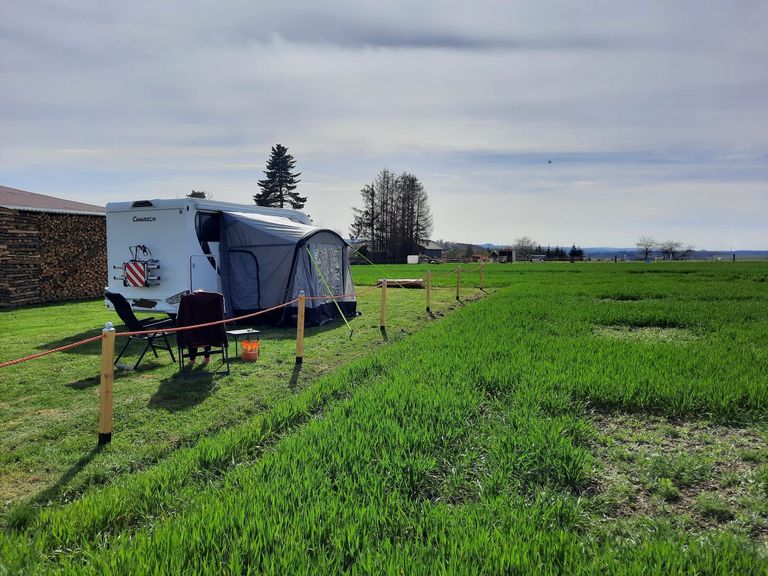 Die Stellplätze befinden sich am Ortsrand auf unseren landwirtschaftlichen Gelände, grasigen Untergrund und an die Feldkante angrenzend. Zum Teil in ganz leichter Schräglage.