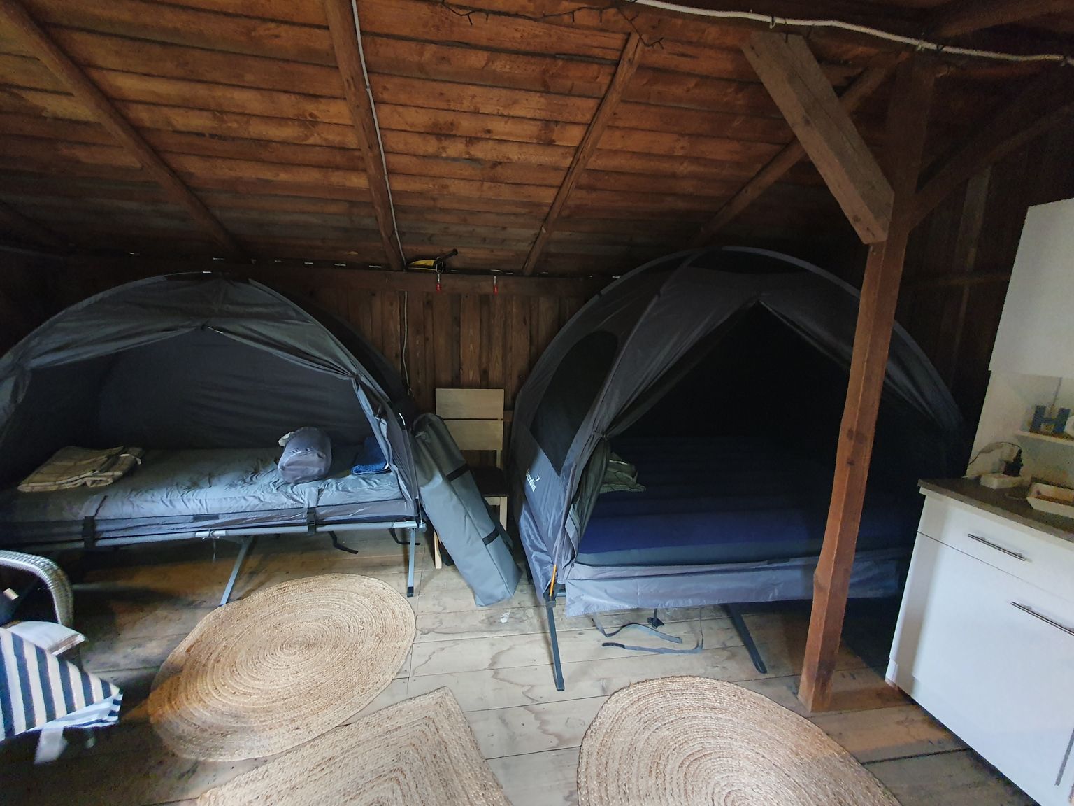 Ihr könnt in unserem Holzschuppen sicher und trocken in einem Feldbettzelt übernachten. Der Schuppen ist direkt am Waldrand zur sächsische Schweiz.