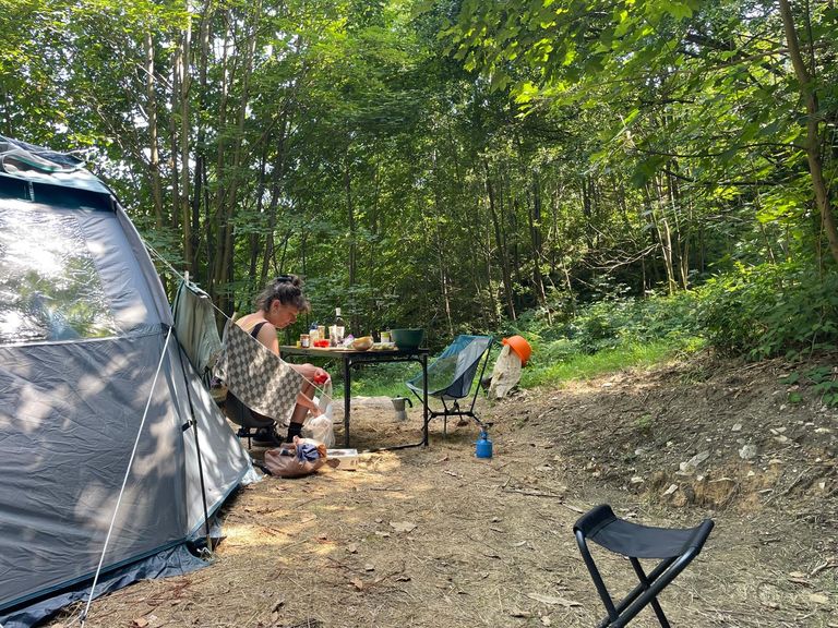 Dieser Campingplatz besteht aus zwei von Hand angelegten Terrassen in einer bergigen Landschaft. Die erste eignet sich als Hauptplatz, während die zweite genutzt werden kann, um ein kleines zusätzliches Zelt für die Kinder aufzuschlagen.