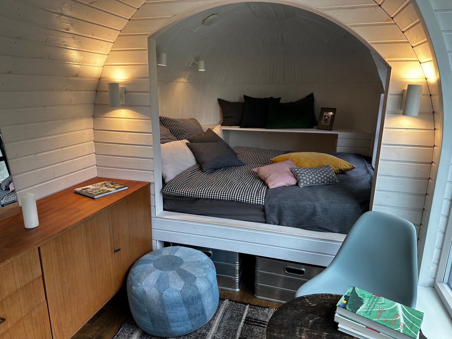 Nicht nur darum ist das Iglu besonders für Menschen optimal, die sich nicht vor hohem Gras und brummenden Insekten scheuen. Der Bauwagen ist mit dichten Fliegengittern ausgestattet. Zwei Menschen, die sich nah sind, finden in der 1,60 breiten Bettkoje gemütlich Platz.