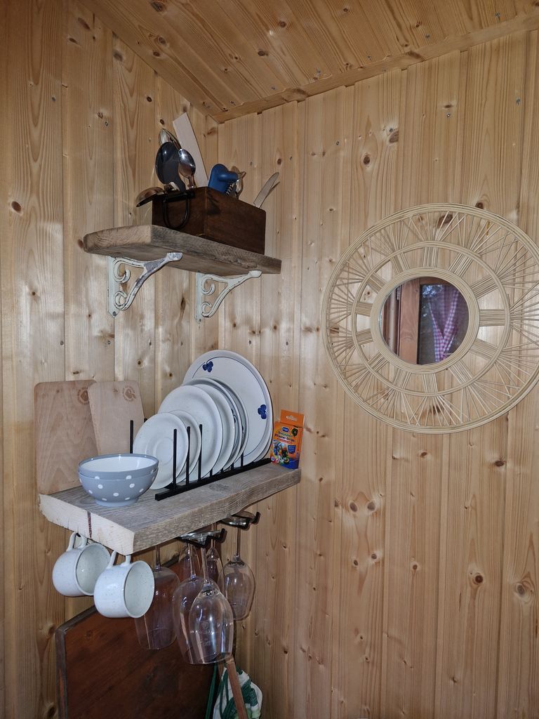Der Bauwagen verfügt über ein 1,40 m breites Bett, das hochgeklappt werden kann, um dann gemütlich im Bauwagen zu sitzen. Ausgestattet ist er mit einfachen Küchenutensilien, Tellern, Besteck und Bettwäsche.